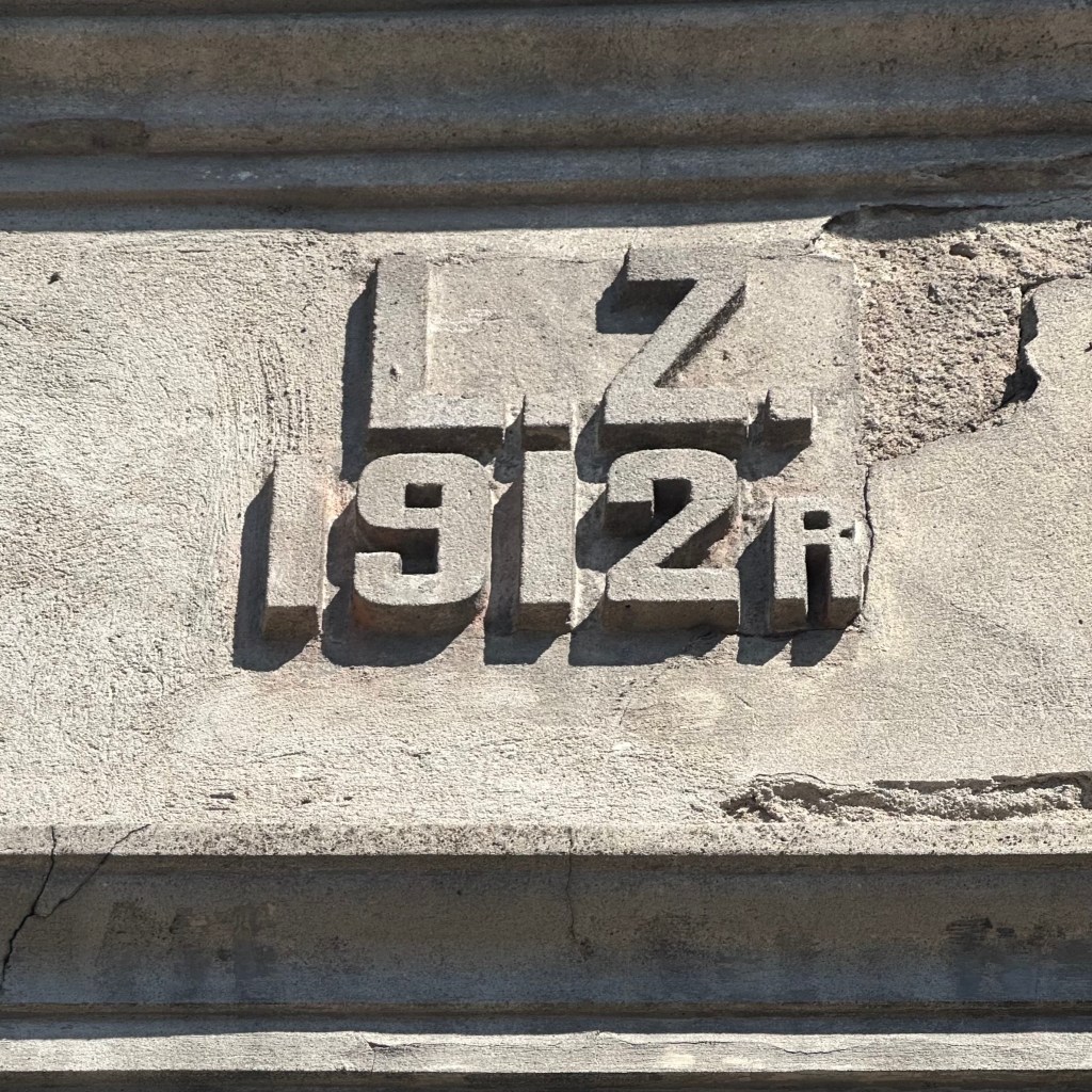 To the left of the balcony, the initials of the owner, L.Z., and the year 1912 stand in sharp relief against the pale plaster wall.