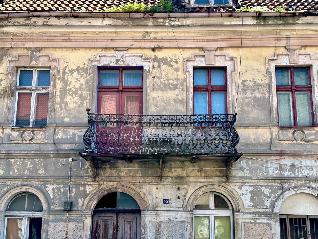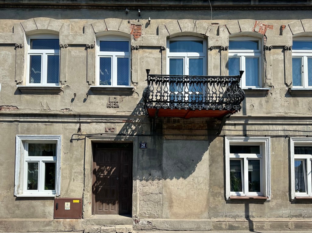 Damian Kruczkowski, director of the Konin Public Library, first noticed the sign around 2017, while he and his sister were out photographing old balconies. It’s hard to imagine that anyone would notice the sign if they weren’t looking for it. It’s under the balcony of a weathered tenement building, just above where the original entrance would have been. The lettering, barely legible today, reads: